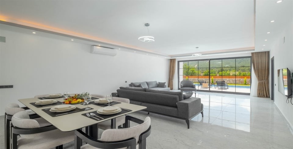 Salon : Salon içerisinde oturma grubu, TV, klima, sehpa bulunmaktadır. Havuz terasına çıkış yapılabilmektedir.