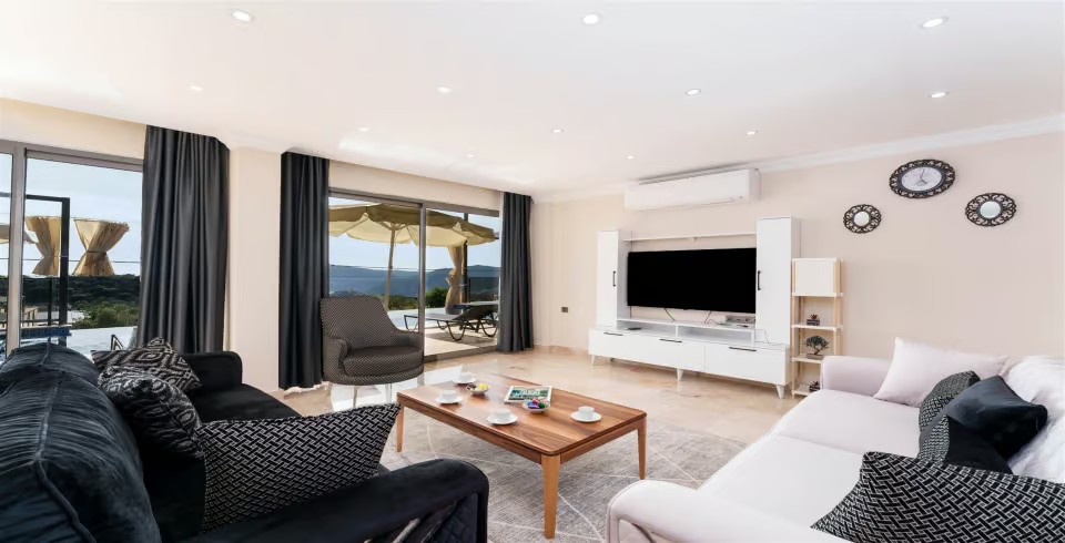 Salon : Villamızın iç dizaynı da son modaya uygun olarak modern bir şekilde tasarlanmıştır. Çeşitli dekoratif eşyalarla süslediğimiz salonumuz havuzlu bahçeye açılıyor. Villa salonunda oturma grubu, TV, internet, klima, sehpa bulunmaktadır.