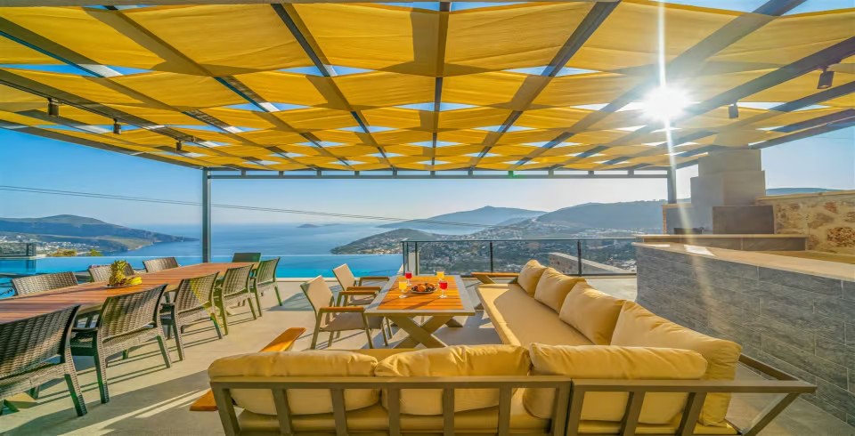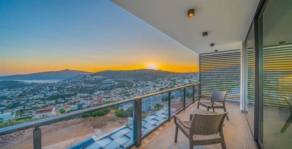 Villanın dış alanı, geniş güneşlenme terası, jakuzili özel havuz, şezlonglar, oturma alanı, barbekü köşesi ve açık mutfak ile donatılmıştır. Panoramik Kalkan manzarasına karşı gün batımını izlemek, tatilin en unutulmaz anlarından biri olur. Günlük havuz ve bahçe bakımı düzenli olarak yapılmaktadır.