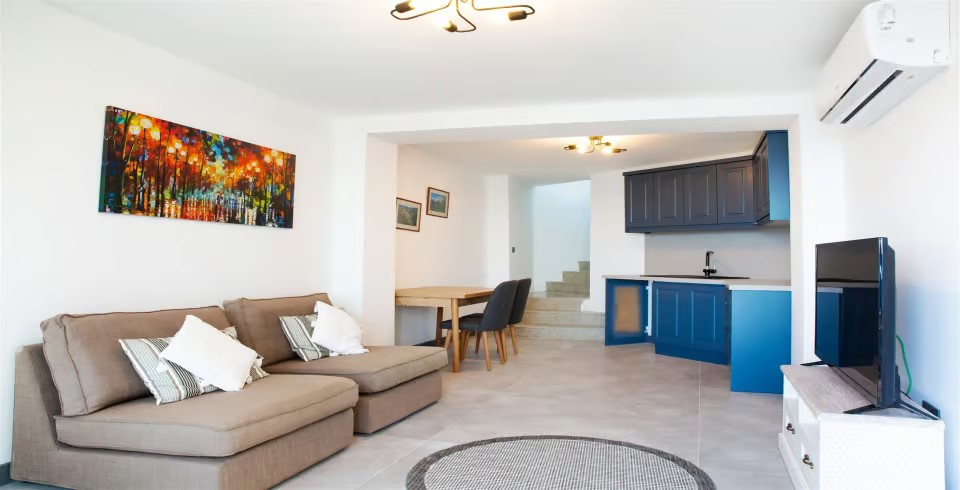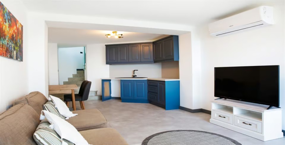 Salon : Villamızın Salonunda oturma grubu, TV, uydu, internet, klima, ve havuz terasına çıkış yapılabilmektedir.
