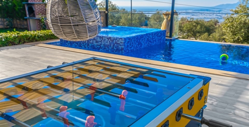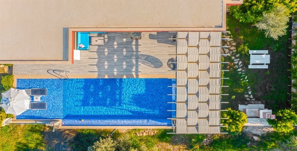 Açık havuz ölçüleri 7 × 3,5 metre olup 1,45 metre derinliğe sahiptir. Havuz terası şezlonglar, güneş şemsiyeleri ve yemek alanı ile donatılmıştır. Bahçesi korunaklı yapısıyla mahremiyet arayanlar için idealdir. Amerikan tarzı mutfak; buzdolabı, ocak, fırın, bulaşık makinesi ve gerekli mutfak gereçleriyle tamamen işlevseldir. Market ve restoranlara yaklaşık 2 km, plaja yaklaşık 13 km mesafededir.
