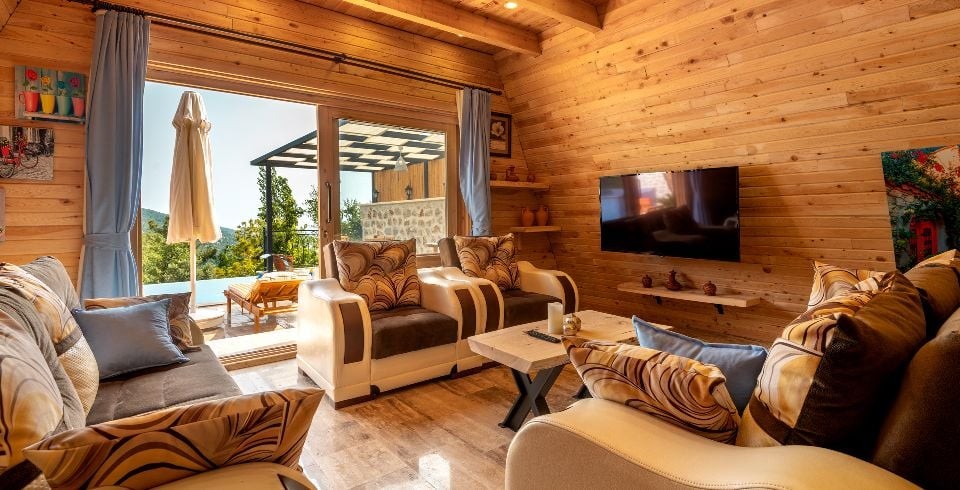 Salon : Villamızın salon kısmında; Oturma grubu, televizyon, klima, sehpa, internet ve havuz terasına çıkış bulunmaktadır.