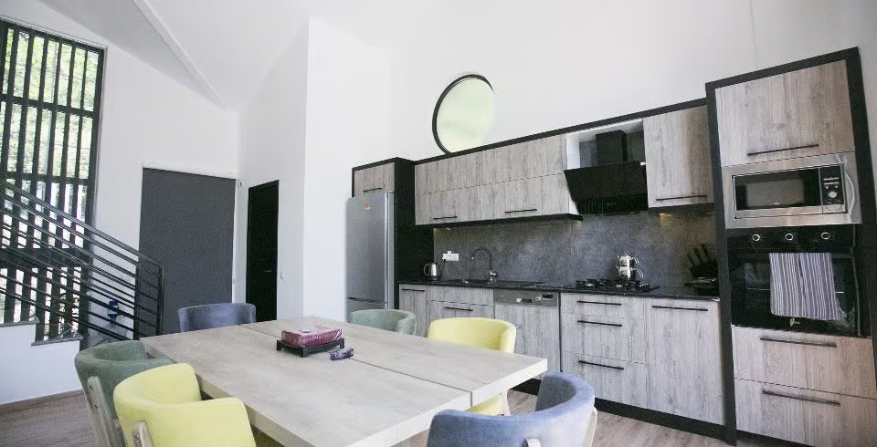 Mutfak: Modern Amerikan mutfakta buzdolabı, bulaşık makinası, fırın, 4'lü ocak, mikrodalga fırın, kettle, tost makinası,4 kişilik yemek masası, yemek takımları, çatal ve bıçak takımları, tencere ve tava takımları, bardaklar bulunmaktadır.