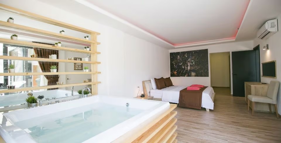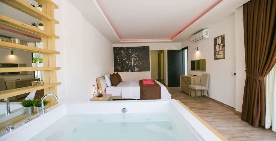 1. Yatak Odası: Çift kişilik yatak, klima, komodin, elbise dolabı, makyaj masası, berjer, jakuzi, banyo ve tuvalet bulunmaktadır.