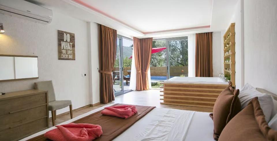 Kalkan'ın İslamlar bölgesinde bulunan villamız 2 yatak odalı 4 kişilik kapasiteye sahiptir. Genellikle balayı çiftlerimizin ve muhafazakar ailelerimizin tercihi olacaktır. 2019 yapımı olan villamız özenle dizayn edilmiş olup çift kişilik süit yatak odasında jakuzi de bulunmaktadır. Ve dışarıdan hiç bir şekilde gözükmemekte olan villamız korunaklıdır. Ayrıca kuş seslerinin verdiği coşku ve doğa manzarası ile beraber huzurlu bir tatil geçirebilirsiniz. Markete ve restorana da bir o kadar yakınlıkta olup Kalkan merkeze araç ile 15 DK sürmektedir.