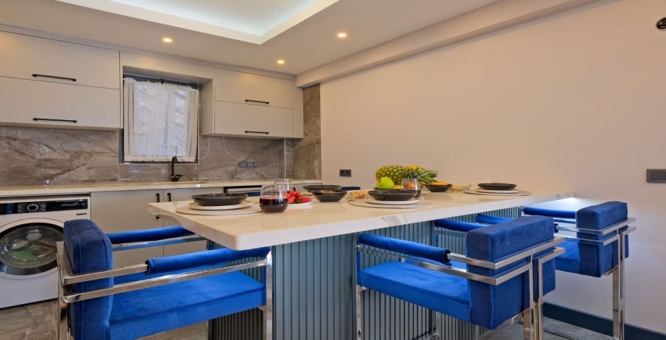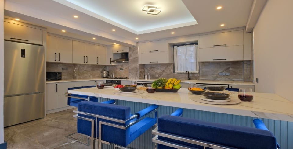 Mutfak: Açık planlı mutfak, 8 kişiye yetecek kadar mutfak malzemeleri, buzdolabı, fırın, ocak, mikrodalga fırın, bulaşık makinesi, çamaşır makinesi, tost makinesi, kettle ve çaydanlık bulunmaktadır..
