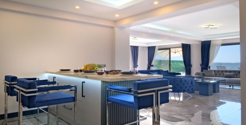 Villanın özel açık yüzme havuzu, korunaklı havuz terası ve bahçesi, mahremiyetin ön planda tutulduğu, huzur dolu bir tatil deneyimi sağlar. Tam donanımlı mutfağında ocak, fırın, buzdolabı ve mutfak gereçleri bulunmaktadır; oturma salonu konforlu koltuklar, TV ve klima ile donatılmıştır.