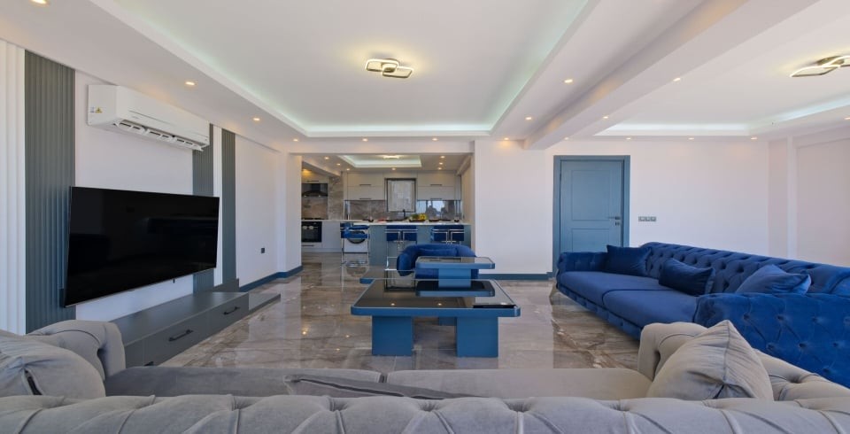 Salon: Özenle döşenmiş salon, modern koltuklar, 8 kişilik yemek masası, LCD TV ve klima bulunmaktadır.