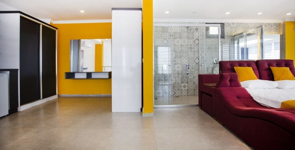 Modern dekor ve lüks dokunuşlarla döşenmiş iç mekân; yatak odasında çift kişilik yatak, klima, jakuzi, özel banyo, oturma alanı ve dışarıdan mahrem olan korunaklı havuz terasına doğrudan geçiş imkânı sunar. Mutfak bölümü amerikan tarzda tam donanımlı olup; bulaşık makinesi, buzdolabı, ocak, su ısıtıcısı gibi araç gereçlerle ekiplidir.