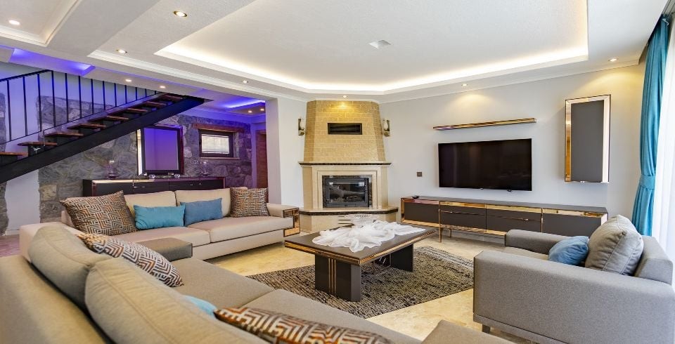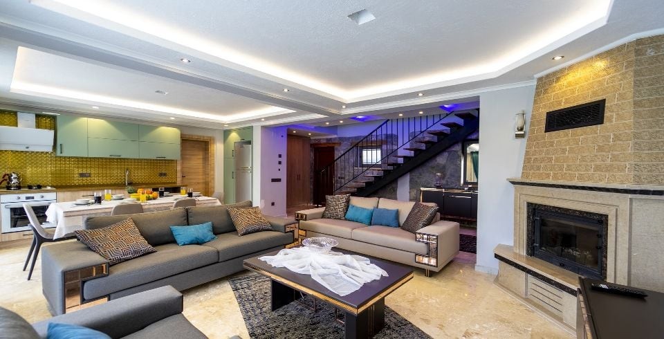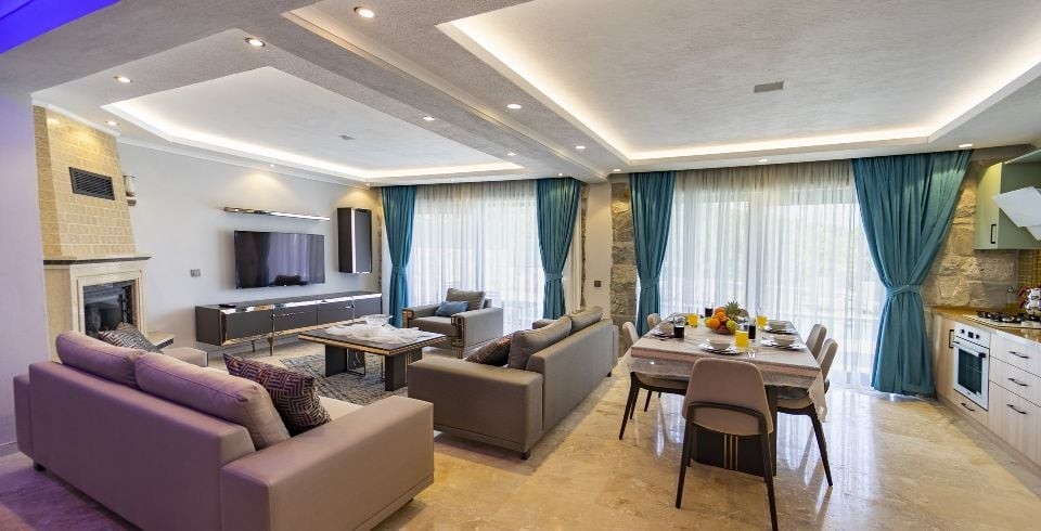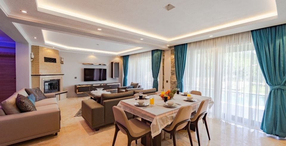 Salon: Villa salonunda konforlu oturma grubu, klima, TV, internet, uydu alıcı, yemek masası, sehpa bulunmaktadır.