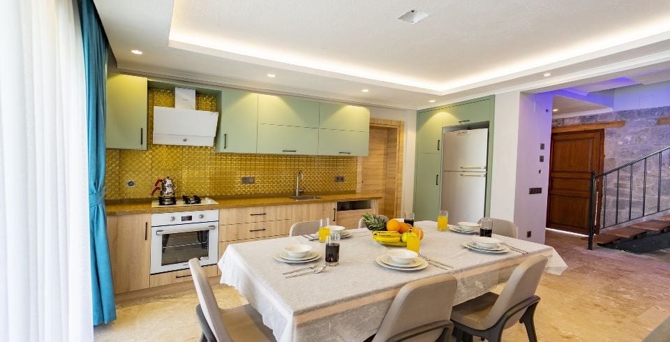 Mutfak: Villamızın mutfağında buzdolabı bulaşık makinası, çamaşır makinası, 4'lü ocak, ketıl, mikro dalga fırın, filtre kahve makinası yemek takımı bulunmaktadır.
