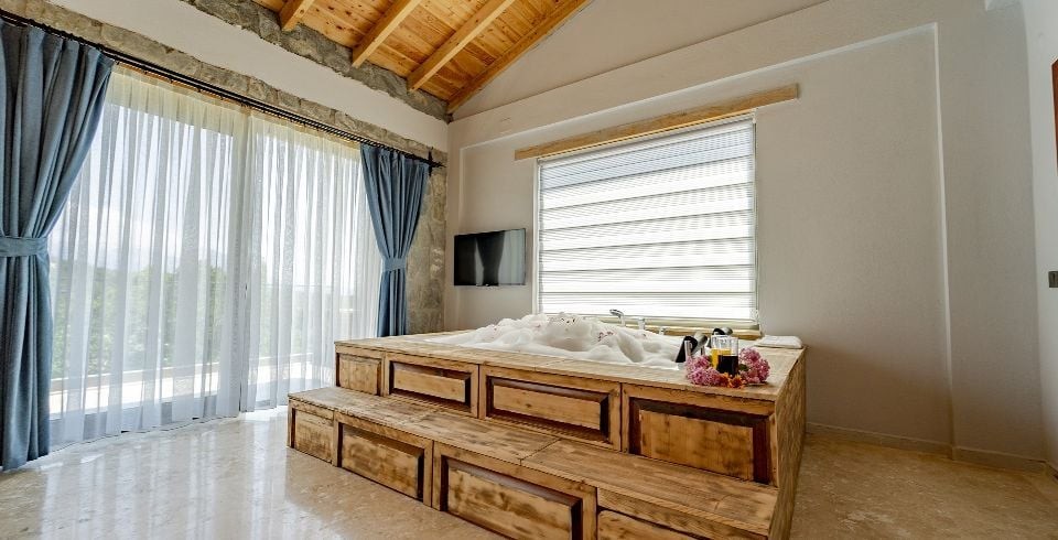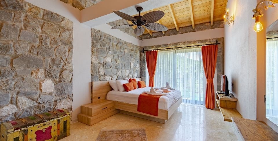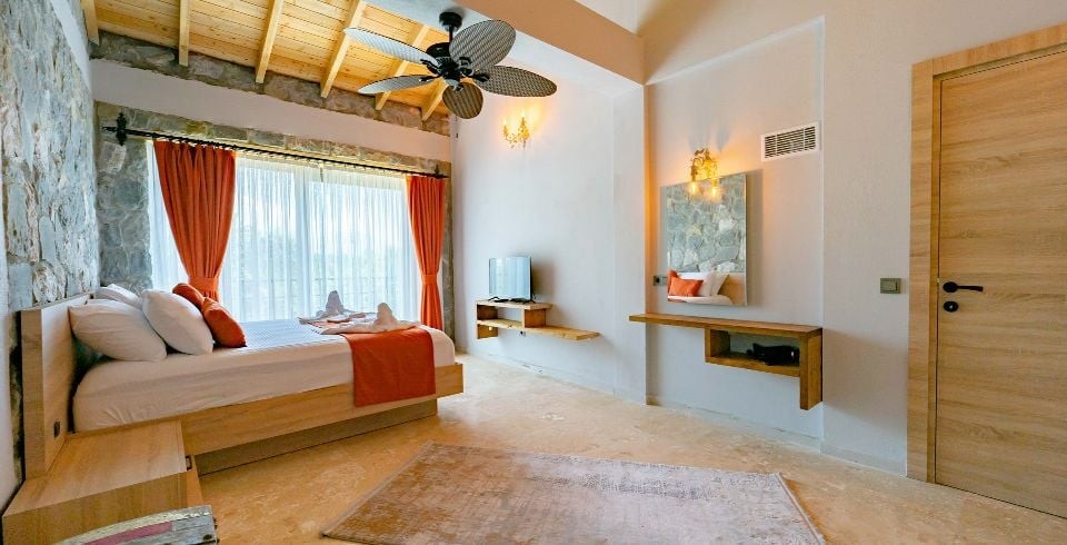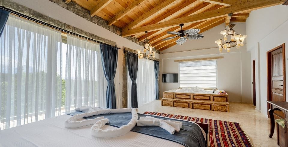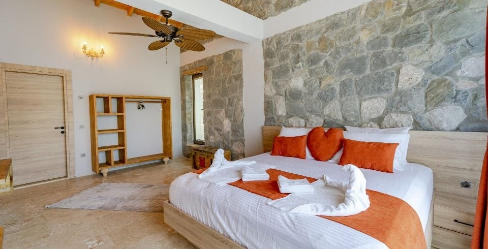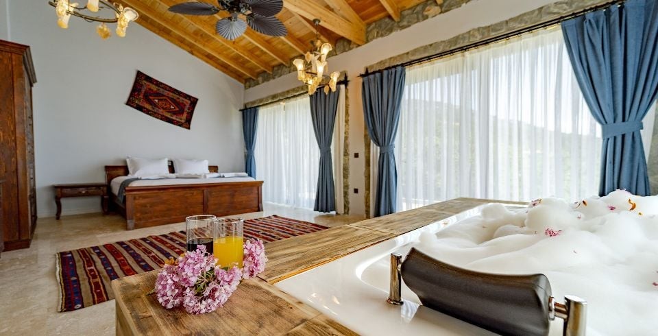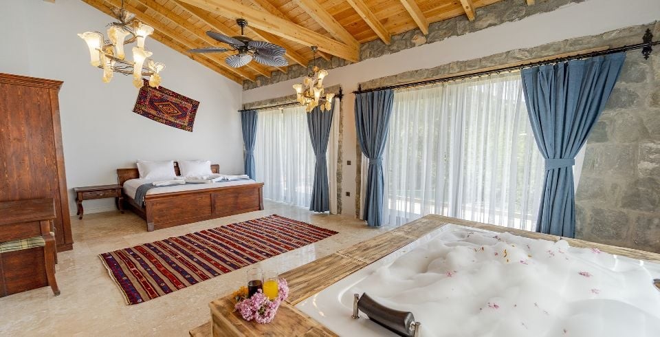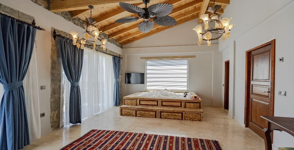 1. Yatak Odası: Çift kişilik yatak, jakuzi, komodin, elbise dolabı, makyaj masası, klima banyo ve tuvalet bulunmaktadır.