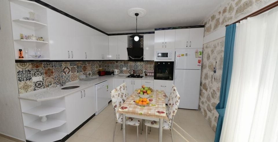 Mutfak : Villamızın geniş Amerikan mutfağı ile sizlere kendi evinizin mutfağı gibi hissettirecek. Ayrıca mutfakta klima, bulaşık makinası, buzdolabı, çamaşır makinası, mikrodalga fırın, tost makinası, ekmek kızartma, su ısıtıcısı, fırın, 4'lü ocak seti ve 4 kişilik geniş yemek masası ile tava tencere vb. mutfak araç gereçlerini kullanma fırsatını sizlere sunuyoruz.