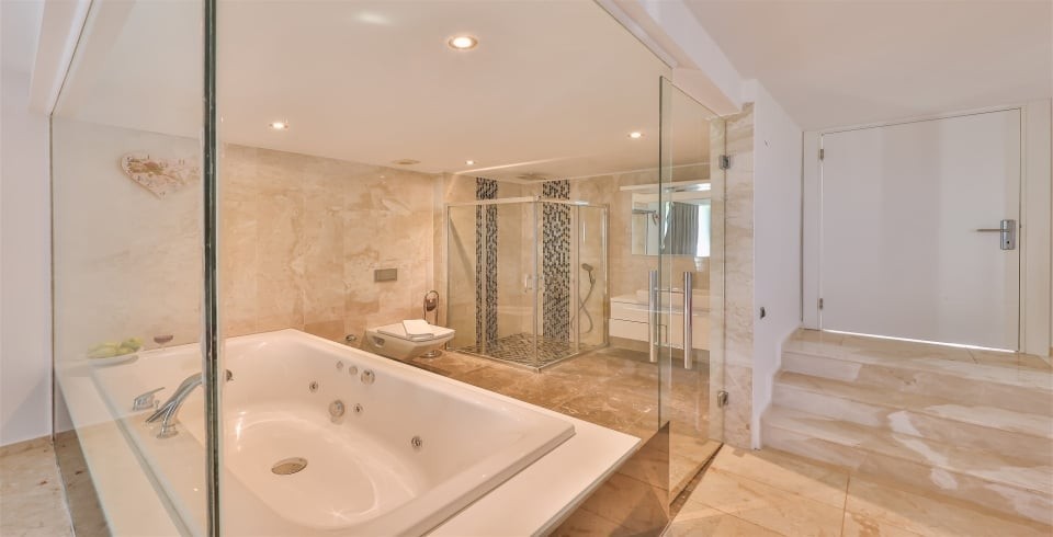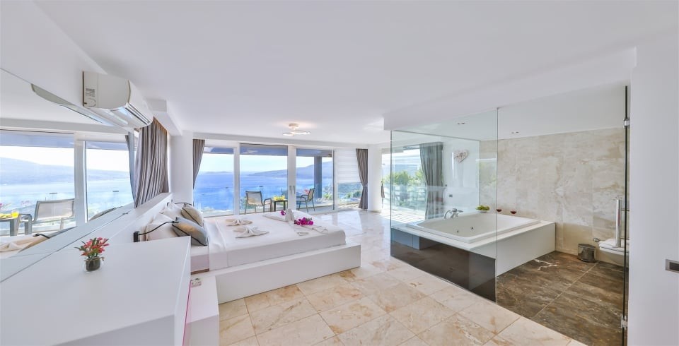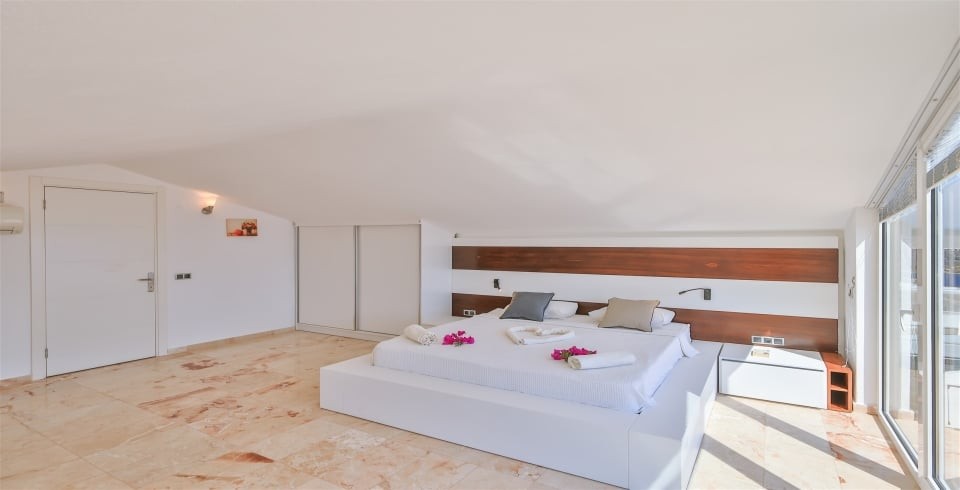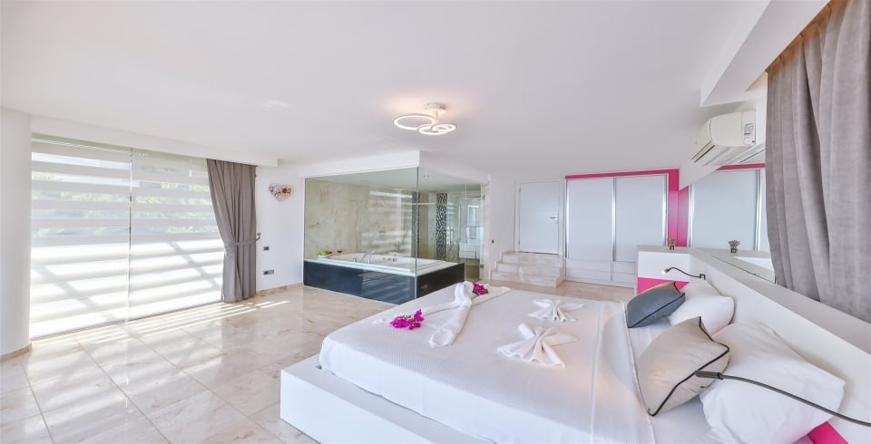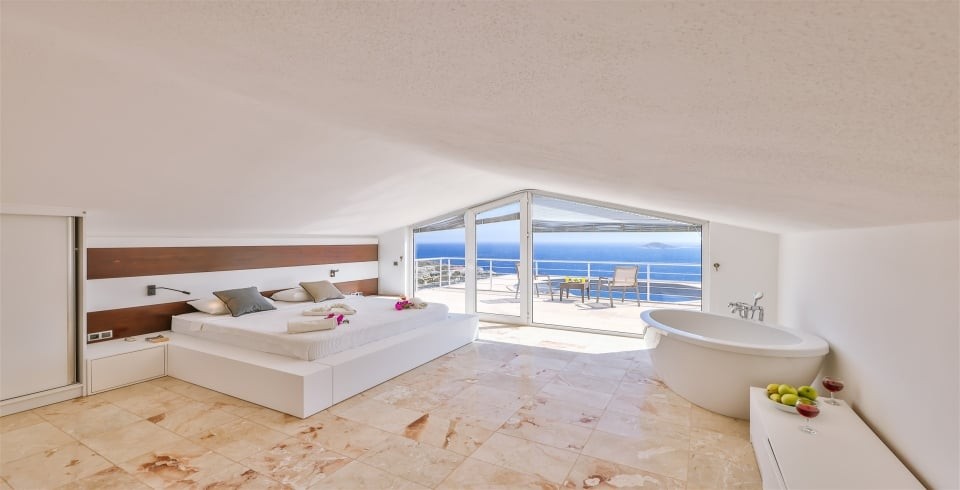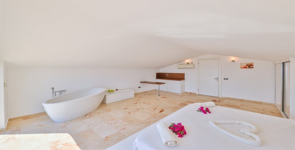 4.Yatak Odası: Çift kişilik yatak, klima, komodin, elbise dolabı, küvet, geniş deniz manzaralı teras bulunmaktadır.