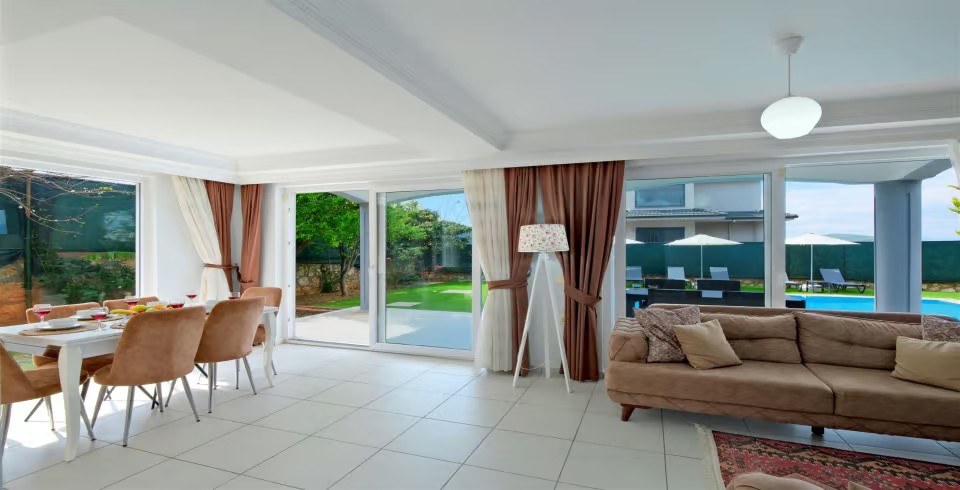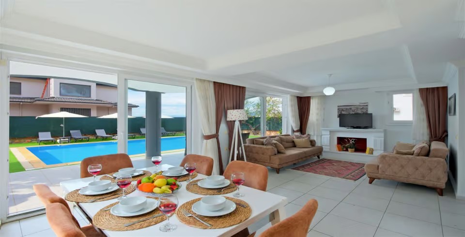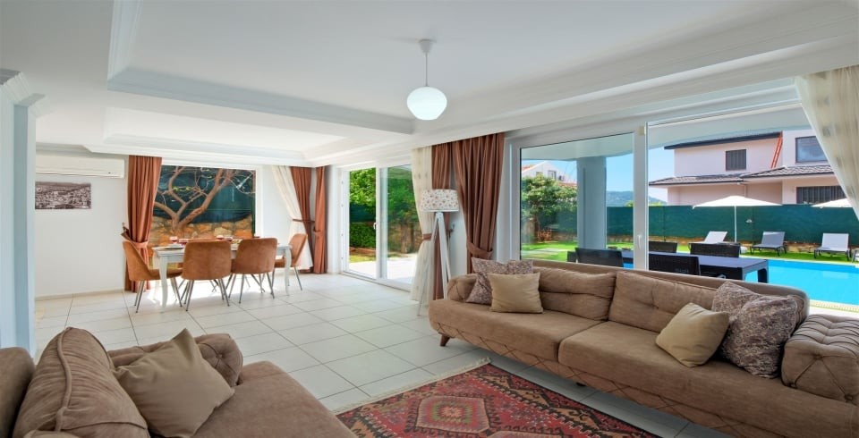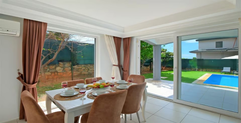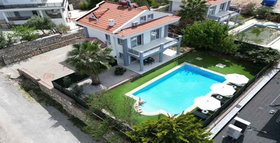 Havuz ve Bahçe: Kiralık yazlık villamızın özel yüzme havuzu ve havuz terasında Şezlonglar , güneş şemsiyesi , mangal , yemek masası ve sandalyeler bulunmaktadır.