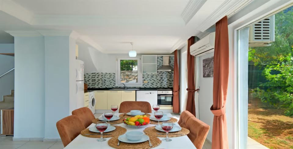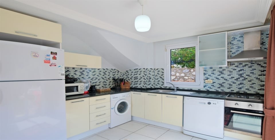 Mutfak: Buzdolabı, çamaşır makinası, bulaşık makinası, fırın, 4 ' lü ocak, tost makinası, elektrikli su ısıtıcısı, yemek takımı, çatal bıçak seti, tavalar, tencereler, bardaklar, yemek masası ve bebek sandalyesi bulunmaktadır.