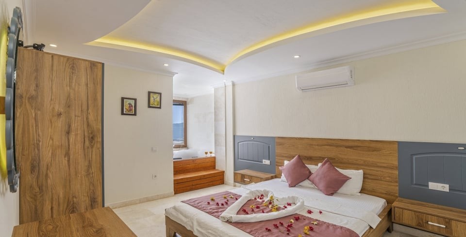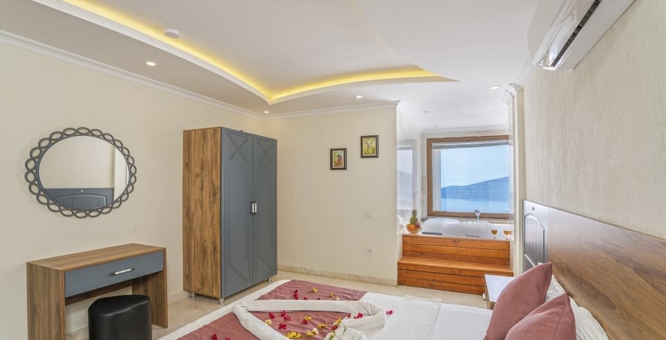 1.Yatak Odası: Deniz manzaralı yatak odasında çift kişilik yatak, televizyon, komodin, klima, elbise dolabı, jakuzi ve banyo tuvalet bulunmaktadır.
