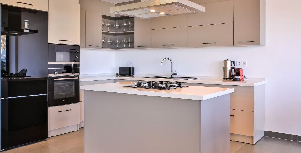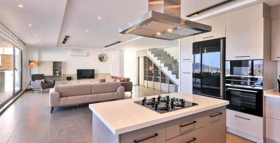 Mutfak : Villa içinde modern Amerikan mutfak bulunmaktadır. Mutfakta mikrodalga fırın, bulaşık makinası, ankastre fırın, buzdolabı, çamaşır makinası, ankastre 4’lü ocak, elektrikli su ısıtıcı kettle, ekmek kızartma makinası, tencere ve tava takımı, 10 kişilik yemek takımı, kaşık ve çatal seti ve bardaklar bulunmaktadır. Havuz başına geçiş bulunmaktadır.