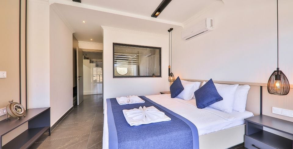 1. Yatak Odası : Süit yatak odası çift kişilik konfor yatak, klima, gardırop, komodin, LCD TV ve banyo-WC ve yer almaktadır.