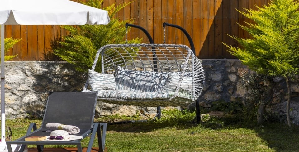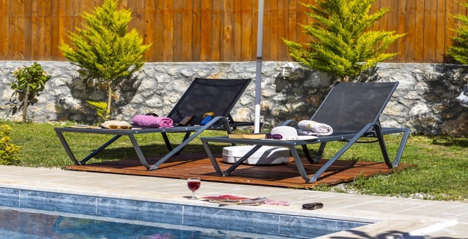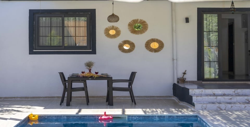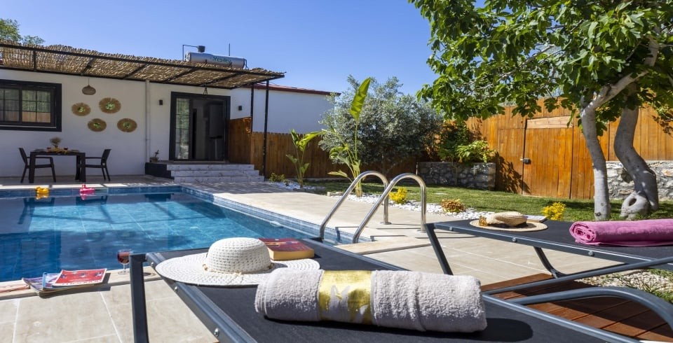Havuz ve Bahçe : korunaklı özel yüzme havuzu, güneşlenme terası, şezlong, şemsiye bulunmaktadır. Eşinizle beraber kendinizi dış dünyadan soyutlayabileceğiniz oturma yerimiz mevcuttur. Bahçemizin keyfini doyasıya çıkarmanız adına mangal ve yemek masası da yer almaktadır.