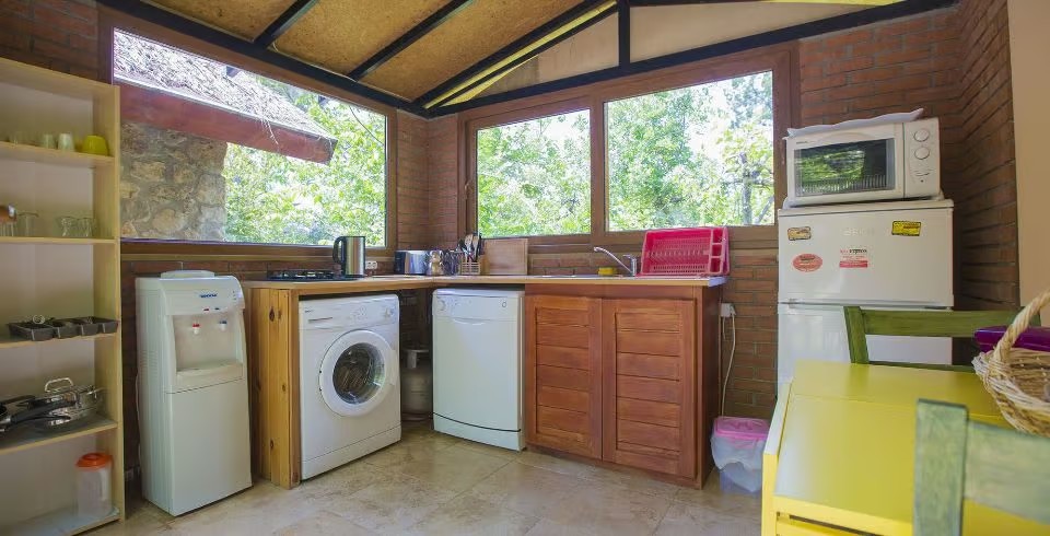 Mutfak : Villamızın modern Amerikan mutfağında 2 kişilik yemek takımı, bulaşık makinası, buzdolabı, çamaşır makinası, 4'lü ocak, fırın bulunmaktadır.
