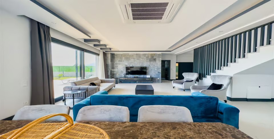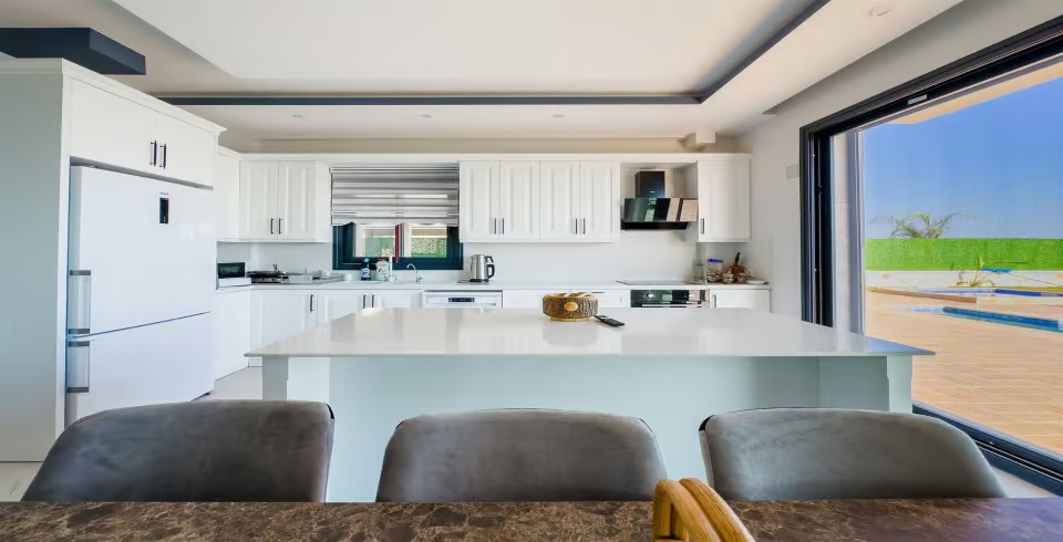 Salon: Oturma grubu, Uydu TV (LCD), Klima, 8 kişilik yemek masası, Havuz kenarına çıkış bulunmaktadır.