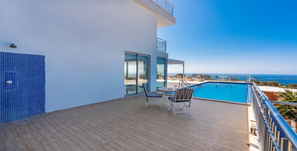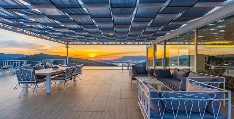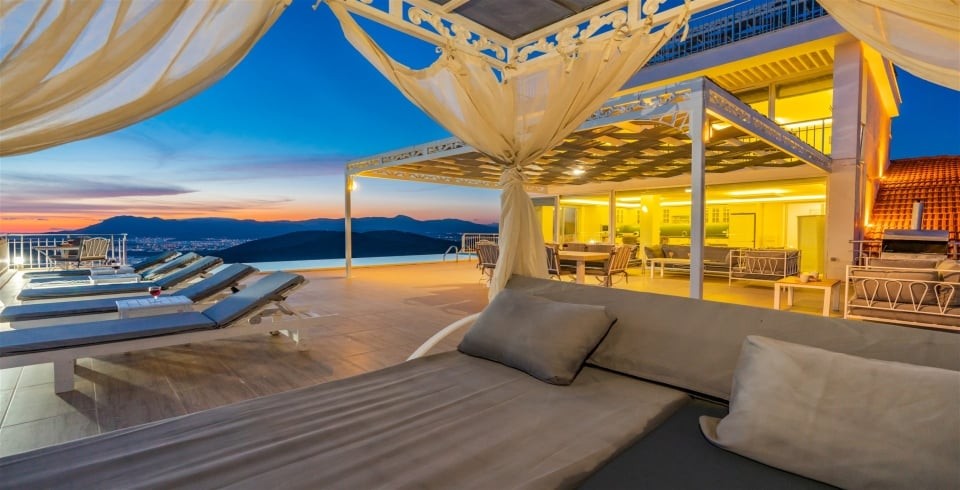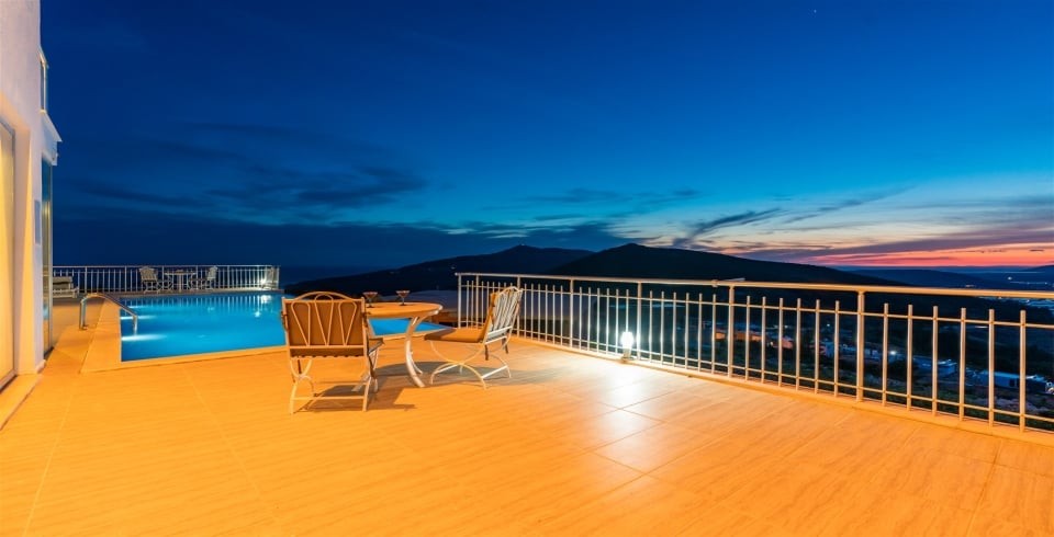 Dış mekanda sonsuzluk hissi veren özel yüzme havuzu, geniş bir güneşlenme alanı ve pergola altında keyifli bir oturma köşesi bulunur. Villa ayrıca sauna, spor alanı, masa tenisi ve ısıtmalı kapalı havuz gibi olanaklarla dört mevsim tatil imkânı sağlar. Çatı terasında yer alan jakuziden Kalkan koyunun gün batımını izlemek ise unutulmaz bir deneyimdir.