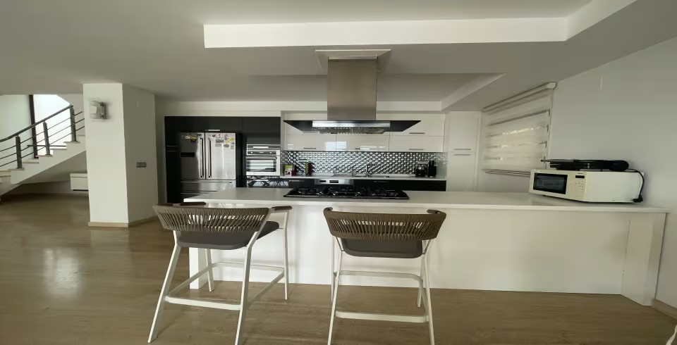 Mutfak: Tam donanımlı içerisinde tüm mutfak araç gereçlerinin olduğu modern Amerikan mutfağa sahiptir. Bu modern mutfak içerisinde buzdolabı, bulaşık makinesi, fırın, ocak, elektrikli su ısıtıcı, yemek masası, yemek takımları, çatal ve bıçak takımları, tencere ve tava takımları ve bardaklar bulunmaktadır.