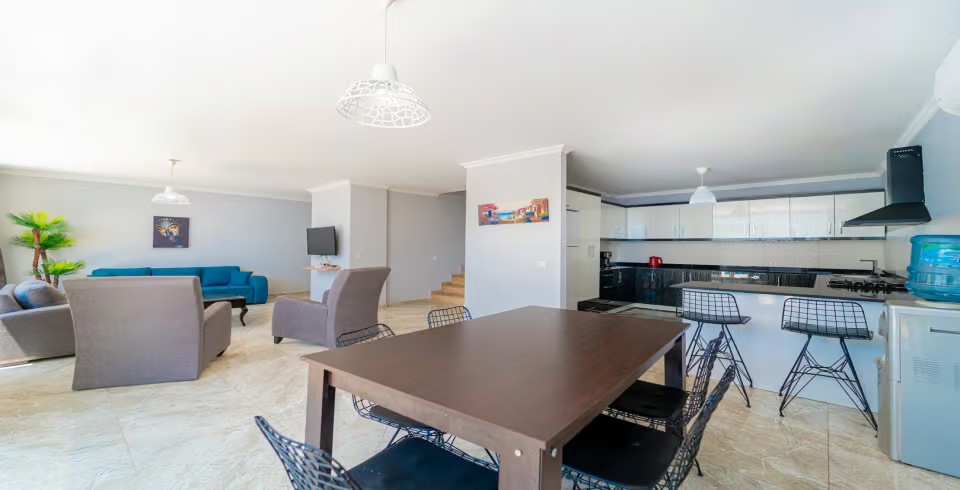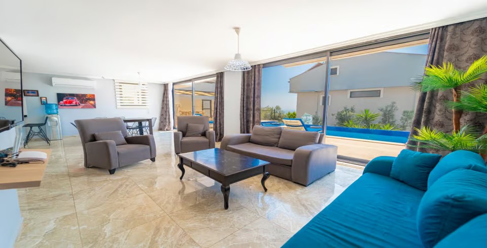 Salon : Villamızı salonunda oturma grubu, klima, yemek masası, uydu alıcı, TV, İnternet bulunmaktadır.
