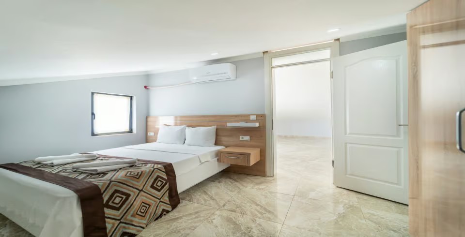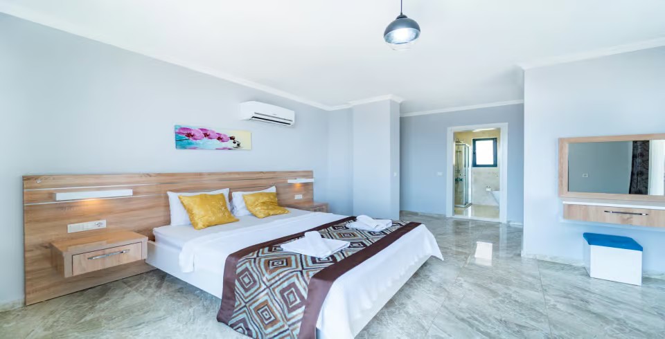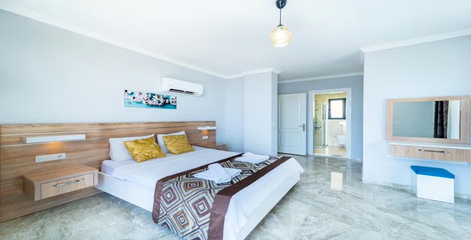 3. Yatak Odası : Çift kişilik yatak, klima, makyaj masası, komodin, elbise dolabı, banyo ve tuvalet bulunmaktadır.