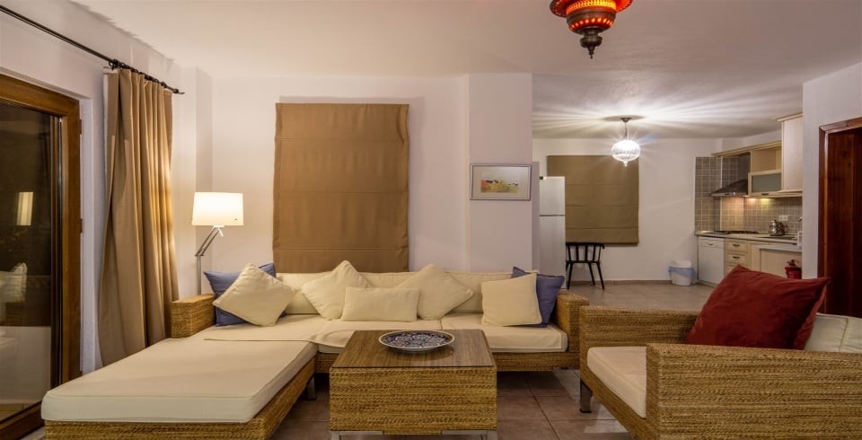 Salon: Oturma grubu, orta sehpa, klima, TV bulunmaktadır.