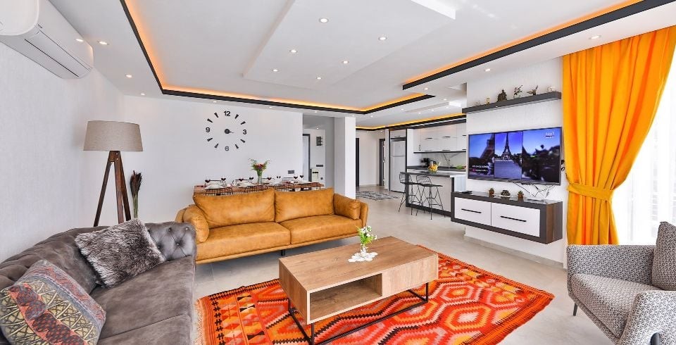Salon: Geniş ve ferah salonumuzda modern oturma grubu, TV, internet, TV ünitesi, ütü, ütü masası, sehpa bulunmaktadır.