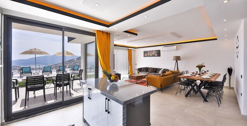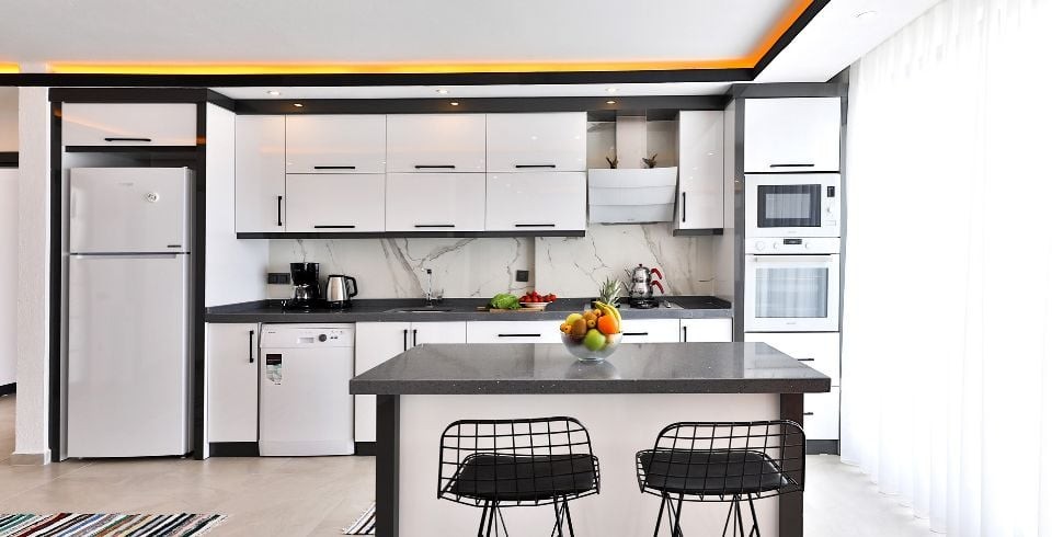 Mutfak : Modern Amerikan mutfağımızda buzdolabı, bulaşık makinası, çamaşır makinası, kettle, 4'lü ankastre ocak, fırın, mikro dalga fırın, yemek masası ve mutfak araç gereçleri eksiksiz olarak bulunmaktadır. Villamızın mutfağından havuz terasına çıkış bulunmaktadır.