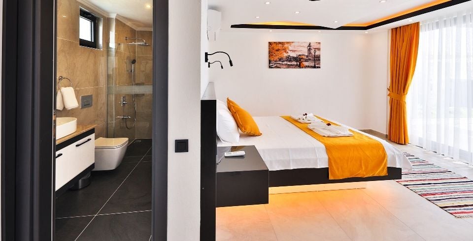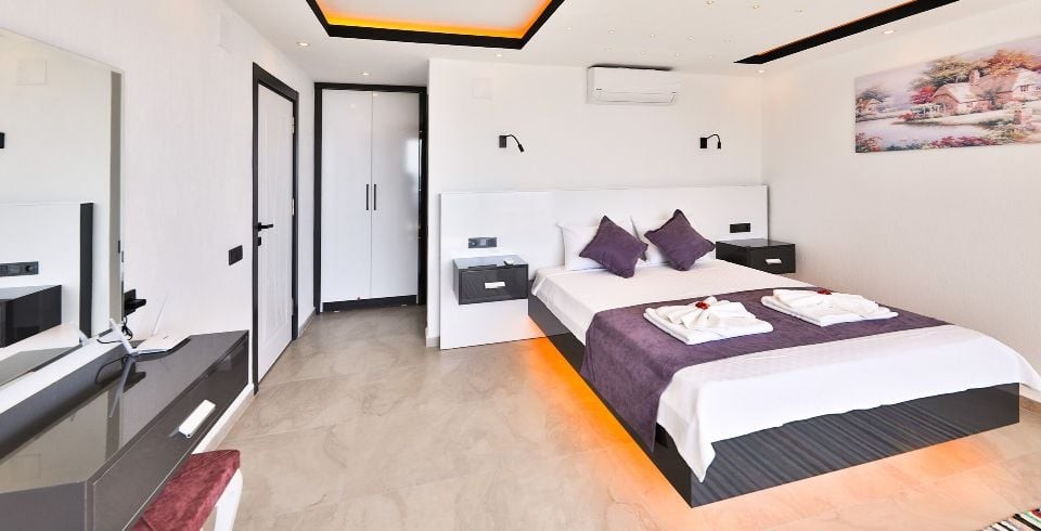 2. Yatak Odası : Çift kişilik süit yatak odası, elbise dolabı, makyaj masası, komodin,  klima, banyo & WC bulunmaktadır.