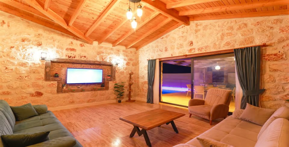 Salon : Villamızın salonu havuz başına çıkışlı olup salonumuzda oturma grubu, klima, TV, internet, uydu, koltuk, langırt, sehpa bulunmaktadır.