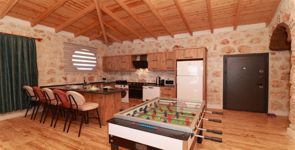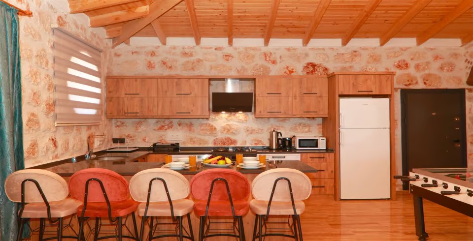 Mutfak : Amerikan açık mutfak, bulaşık makinası, buzdolabı, çamaşır makinası,mikro dalga fırın, su ısıtıcısı, kahve makinası, fırın,tost makinası, 4'lü ocak seti, yemek masası ve mutfak araç gerekleri 4 kişilik olarak mevcuttur.