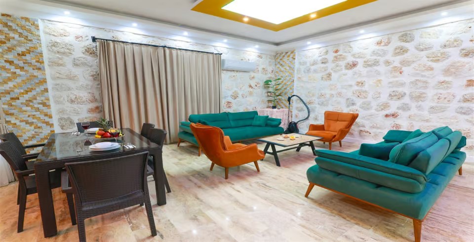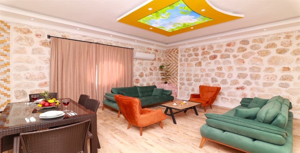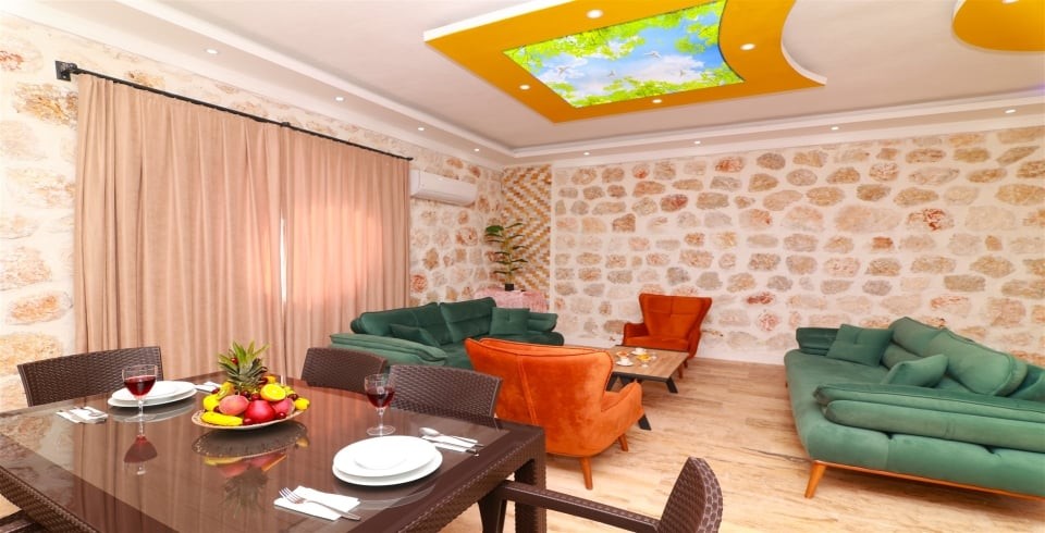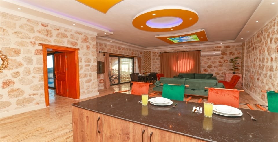 Salon: Villa salonunda konforlu oturma grubu, klima, TV, internet, uydu alıcı, yemek masası, sehpa bulunmaktadır.