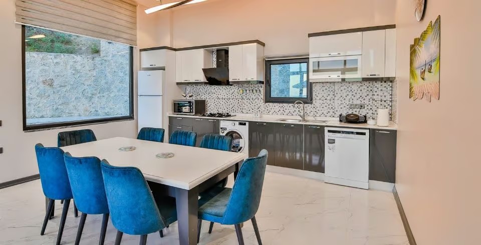 Mutfak : Yemek yapmaktan hoşlanmayan misafirlerimiz bile manzara karşısında kendilerini yemek hazırlarken bulabilirler. Manzara hem iştahınızı açacak hem de yemek yapma hevesinizi getirecektir. Modern Amerikan mutfağımızda buzdolabı, bulaşık makinesi, çamaşır makinesi, ankastre fırın, mikrodalga fırın, ankastre 4’lü ocak, elektrikli su ısıtıcısı, 8 kişilik yemek takımı ve eksiksiz çeşitli mutfak araç-gereçleri bulunmaktadır.