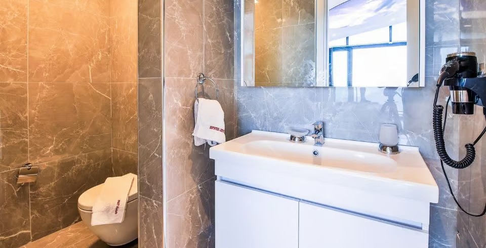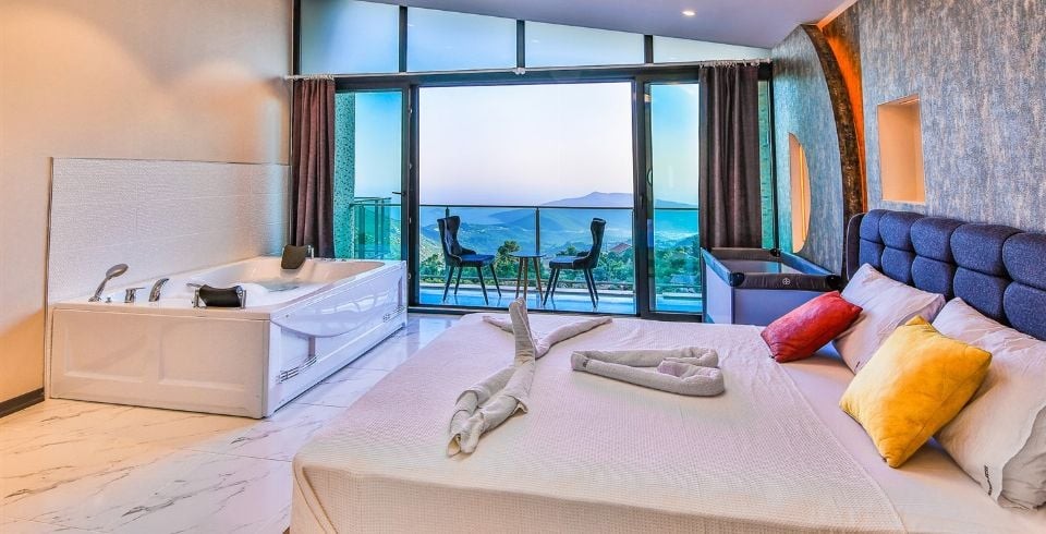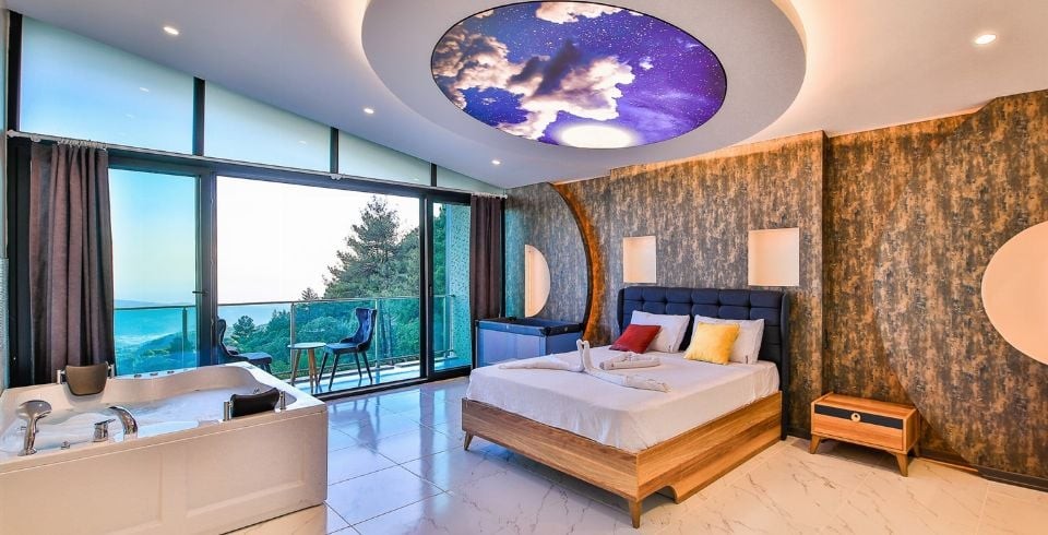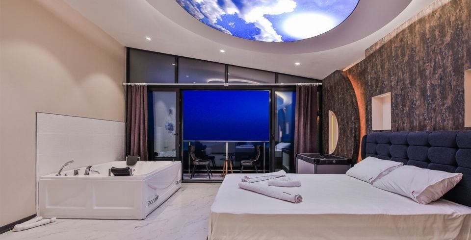 1. Yatak Odası : İçerisinde jakuzi bulunan süit odamızda çift kişilik yatak, komodin, klima, makyaj masası, elbise dolabı, masa-sandalye, klima, banyo ve lavabo bulunmaktadır.