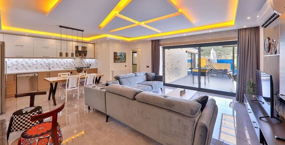 Salon : Villa  salonunda konforlu oturma grubu, klima, TV, internet, uydu alıcı, yemek masası, sehpa bulunmaktadır.