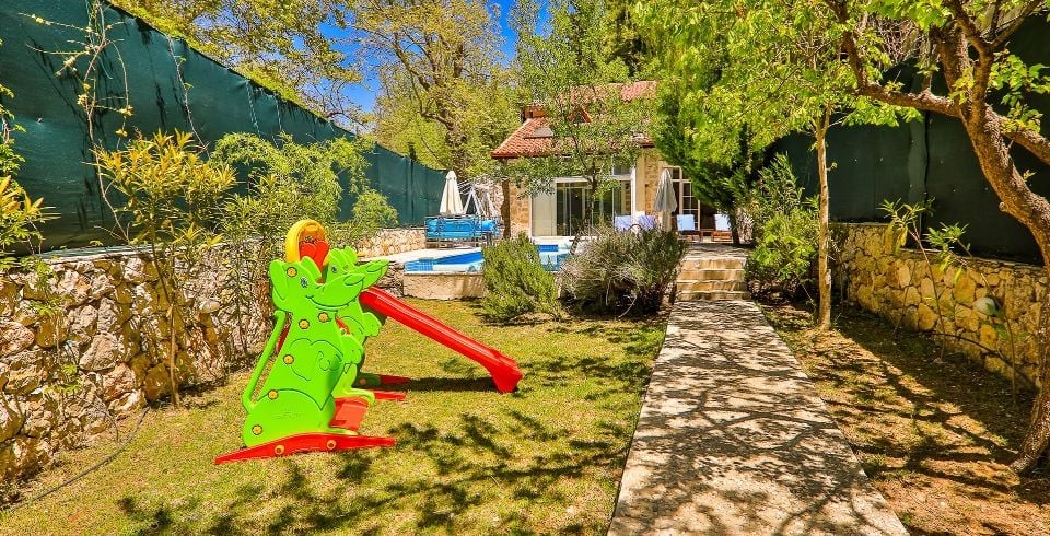 Bahçe : Villamızın bahçesinde özel yüzme havuzu, güneşlenmeniz için 4 adet şezlong, güneşlenme terası, 4 kişilik masa, oturma grubu, mangal keyfiniz için barbekü, güneş şemsiyesi bulunmaktadır.