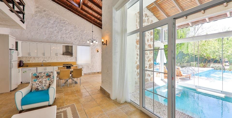 Salon : Villa Kaputaş’ın salonunda sizi şık bir oturma grubu ile, klima, TV, internet, uydu, koltuk, sehpa ile ferah bir salon bekliyor olacaktır. Havuz terasına çıkış yapılmaktadır.
