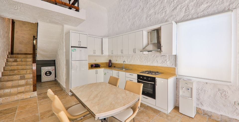 Mutfak : Villamızın geniş Amerikan mutfağı ile sizlere kendi evinizin mutfağı gibi hissettirecek. Ayrıca mutfakta klima, bulaşık makinası, buzdolabı, çamaşır makinası, ekmek kızartma, su ısıtıcısı, fırın, 4`lü ocak seti ve 4 kişilik geniş yemek masası ile tava tencere vb. mutfak araç gereçlerini kullanma fırsatını sizlere sunuyoruz.
