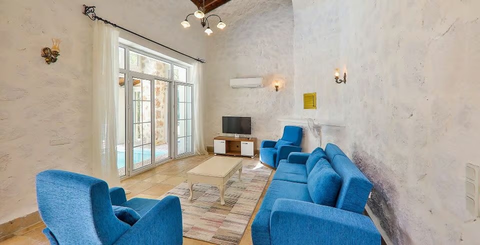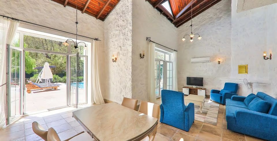 Salon : Villa Kaputaş 3’ün salonunda sizi şık bir oturma grubu ile klima, televizyon, internet, uydu, koltuk, sehpa ile ferah bir salon bekliyor olacaktır. Havuz terasına çıkış yapılmaktadır.