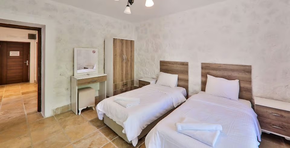 2. Yatak Odası : 2 adet tek kişilik yatak, klima, elbise dolabı, makyaj masası, komodin, banyo ve lavabo bulunmaktadır.