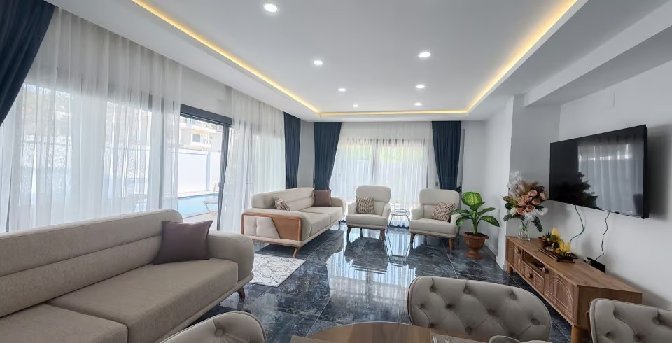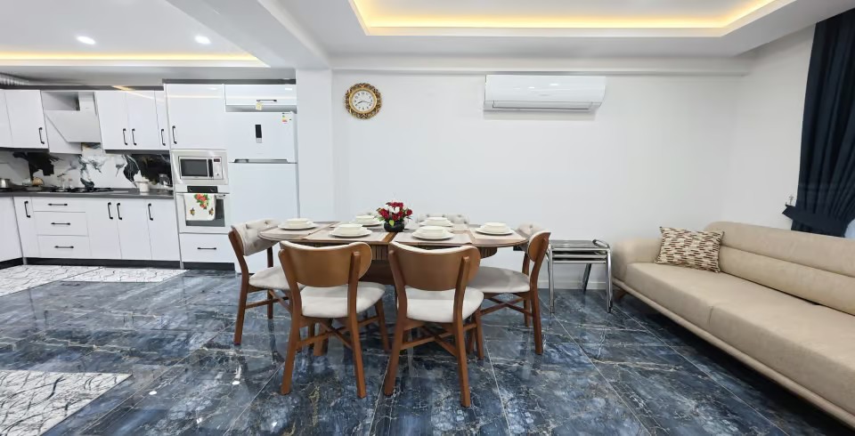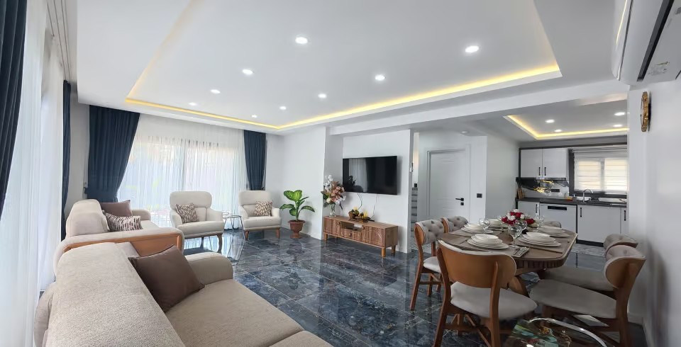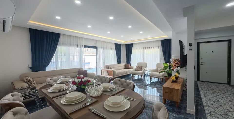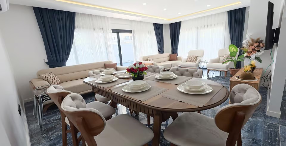 Salon: Özenle döşenmiş salon, modern koltuklar, 8 kişilik yemek masası, LCD TV ve klima bulunmaktadır.