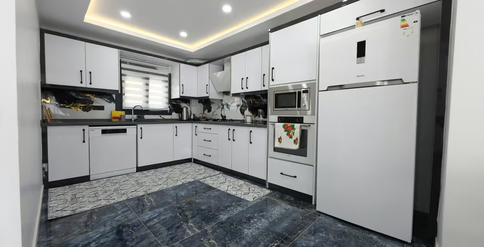 Mutfak: Tam donanımlı modern Amerikan mutfak içerisinde buzdolabı, bulaşık makinesi, fırın, ocak, mikrodalga fırın, tost makinası, Türk kahvesi makinası, elektrikli su ısıtıcı, yemek masası, yemek takımları, çatal ve bıçak takımları, tencere ve tava takımları ve bardaklar bulunmaktadır.