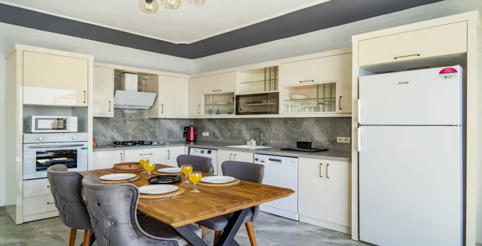 Mutfak : Buzdolabı, çamaşır makinesi, mikrodalga fırın, 4’lü ocak, çatal-bıçak takımı, tencere-tava takımı, bulaşık makinesi bulunmaktadır.