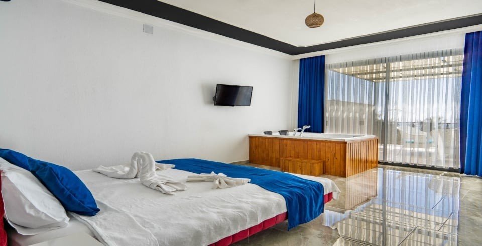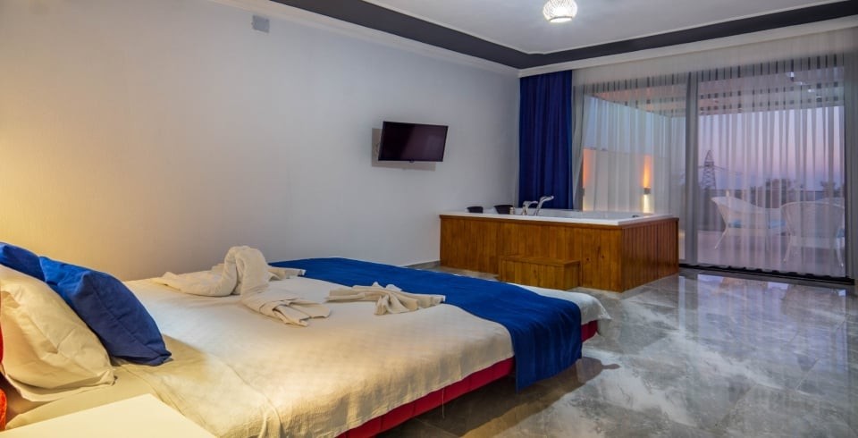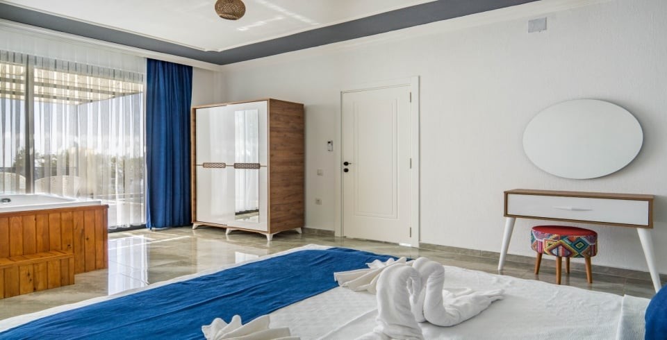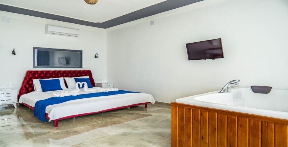 1. Yatak Odası : Çift kişilik yatak, klima, komodin, jakuzi, makyaj masası, elbise dolabı, Tv, banyo ve lavabo bulunmaktadır.