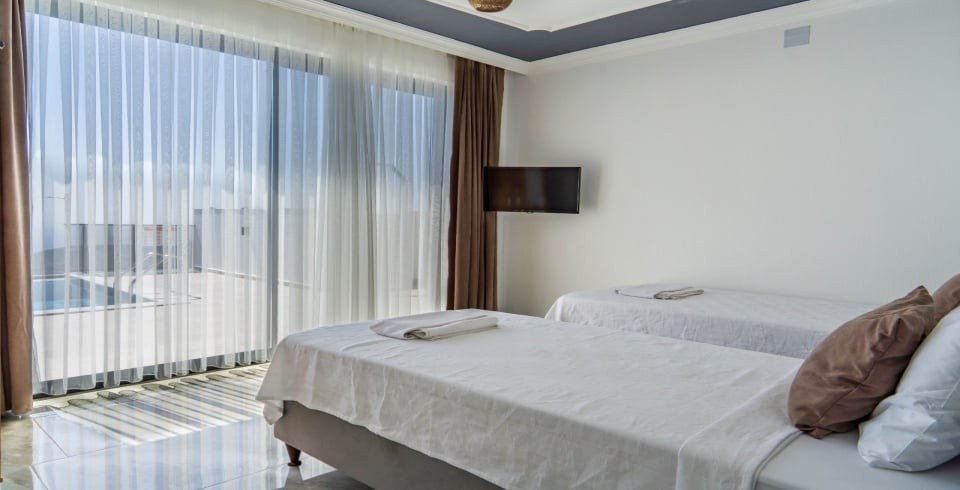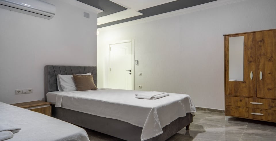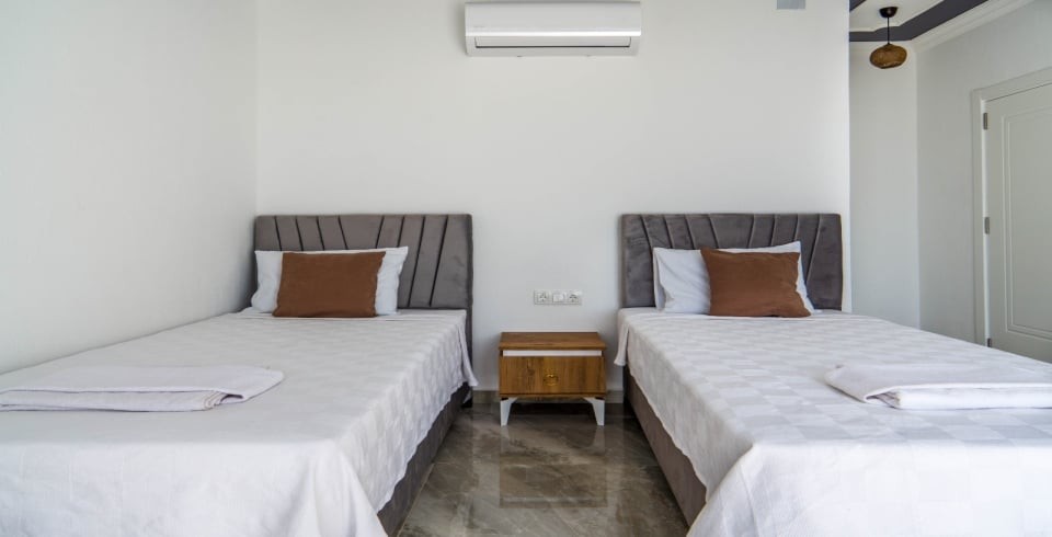 2. Yatak Odası : 2 adet tek kişilik yatak, komodin, klima, makyaj masası, TV, elbise dolabı, banyo ve lavabo bulunmaktadır.